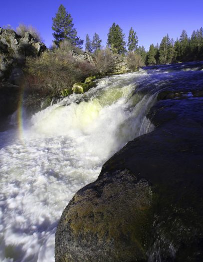 Dillon Falls, which is within Deschutes National Forest, features a large drop followed by a series of rapids that surge through a narrow gorge of lava rock.