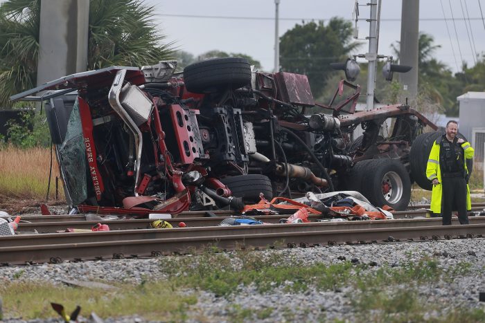 The crash happened at 10:45 a.m. in crowded downtown Delray Beach. In the aftermath the Brightline train was stopped on the tracks, its front destroyed, about a block away from the Delray Beach Fire Rescue truck. Its ladder was ripped off and in the grass several yards away, The Sun-Sentinel reported.