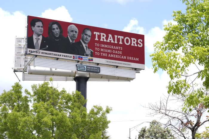 Miami Democrats set up a billboard on a heavily traveled expressway showing the three House members and Secretary of State Marco Rubio, a former Florida senator who is also of Cuban descent, with the label “traitors.”