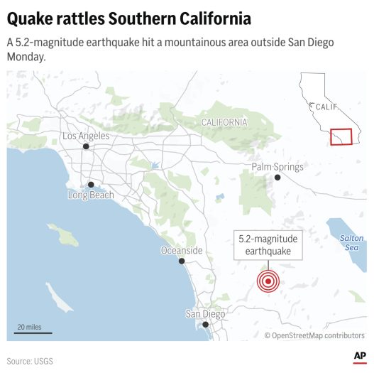 SAN DIEGO (AP) — A 5.2-magnitude earthquake shook Southern California on Monday morning, sending boulders tumbling onto rural roadways outside San Diego, items rattling off shelves and elephants at the San Diego Zoo Safari Park scrambling to encircle their young. Officials reported no injuries or major damage. The quake, according to the U.S. Geological Survey, […]