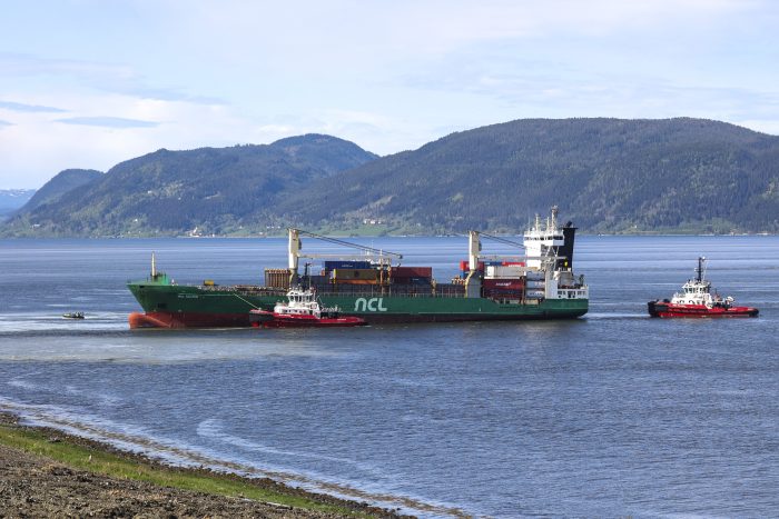 A tugboat hauled and refloated the NCL Salten off the shore of the Trondheim fjord in the morning hours. The vessel was being taken to the nearby harbor of Orkanger.