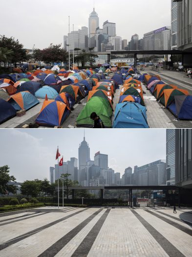 In Sept. 2014, protesters fended off police’s pepper spray using their umbrellas in a 79-day face-off, and the largely peaceful Umbrella Movement saw more people join an encampment around the two nearby bridges.