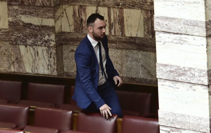 The incident occurred during a debate on whether to lift the immunity from prosecution of the Hellenic Solution party leader following a complaint by a relative of Floros.