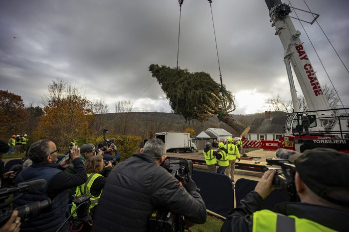 The first Rockefeller Center Christmas tree to come from Massachusetts since 1959, the towering spruce has drawn plenty of attention in West Stockbridge. Locals and tourist alike have flocked to see the 11-ton (10-metric ton) tree in recent days, as workers high up in the canopy prepped it for its trip to New York.