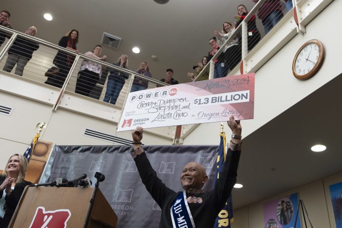 PORTLAND, Ore. (AP) — Cheng “Charlie” Saephan wore a broad smile and a bright blue sash emblazoned with the words “Iu-Mien USA” as he hoisted an oversized check for $1.3 billion above his head.
