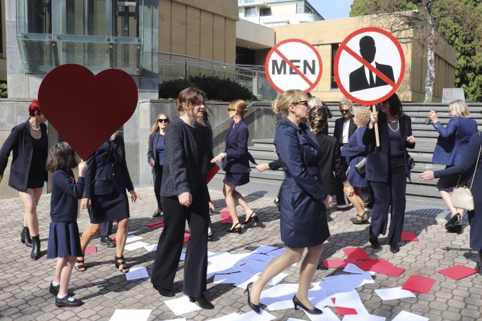 When the appeal hearing opened last week, Kaechele repeated her performance from earlier, showing up at the Supreme Court in Tasmania’s city of Hobart surrounded by dozens of women supporters in navy-colored suits and wearing bright red lipstick. The women danced out of the court in single file, some holding placards denouncing men.
