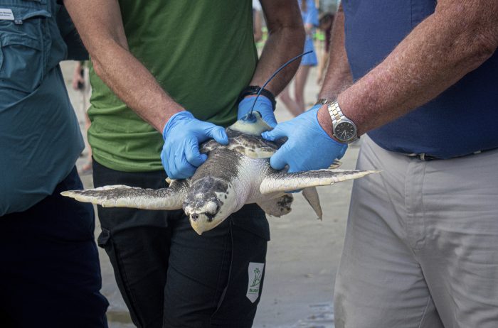 The Kemp’s ridley sea turtle is native to the coastal waters of the Gulf of Mexico and Atlantic Ocean and is the smallest sea turtle at 27-32 inches (68-81 cm) long and weighs 75-100 pounds (34 to 45 kg), according to the Texas Parks and Wildlife Department.