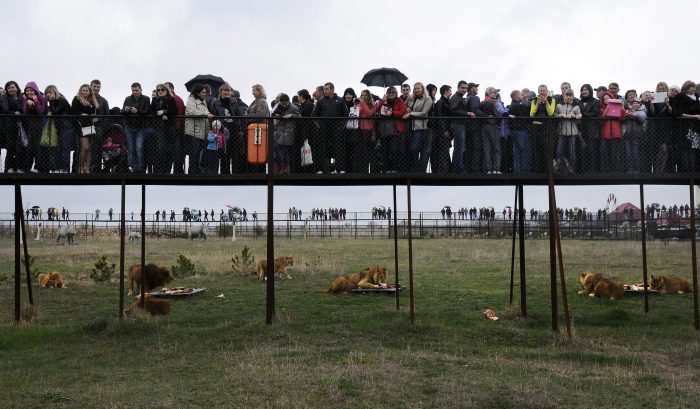 According to the park’s website, it holds about 60 lions in its more than 30 hectares (75 acres). About 1 kilometer (0.6 miles) of elevated walkways allow visitors to observe lions roaming freely.