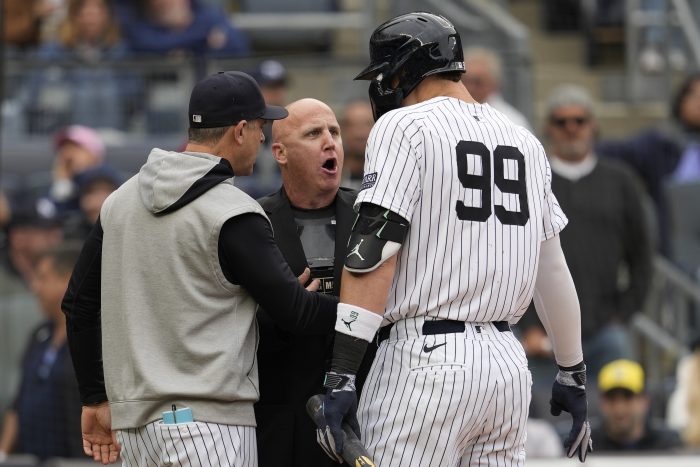 Judge had two hits, including an RBI double to start New York’s rally in the third before getting ejected by plate umpire Ryan Blakney for arguing a called third strike. Judge thought a full count fastball by Tyler Holton was slightly outside and he was quickly tossed after looking back at Blakney.