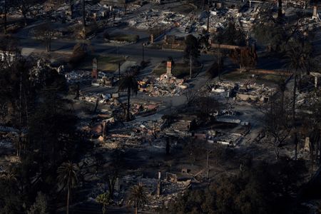 LOS ANGELES (Reuters) – From the air, the once-thriving Los Angeles neighborhoods wiped out by recent wildfires now appear as block after block of grayish-brown ash and rubble. Sunlight reflects off the skeletal remains of homes, restaurants and shops.