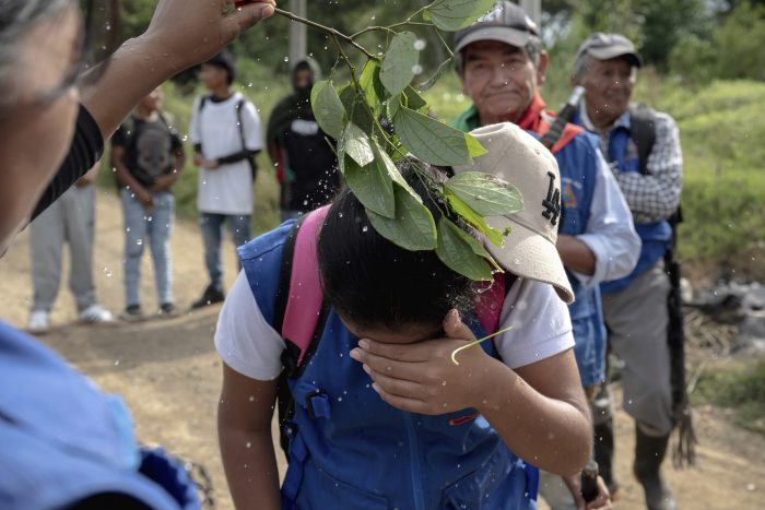 CALOTO, Colombia (AP) — Indigenous Nasa children are gently splashed with water using a leafy branch — a ritual meant to protect them and symbolically “open the path” — before setting off with wooden signs they had painted with messages like “We were born to protect the environment” and “Peace, please.”