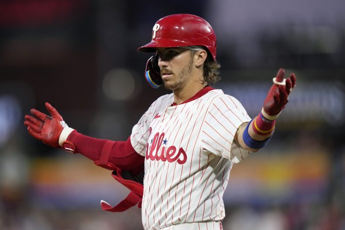 Whit Merrifield — who led the AL with 10 triples in 2019 but hadn’t hit one since 2022 — opened the fifth with a lazy fly to center that Andy Pages lost in the lights. Merrifield hightailed it around first and landed on third for his 27th career triple. After Garrett Stubbs and Schwarber failed to hit the ball out of the infield, Merrifield scored on Trea Turner’s grounder. Turner made it to third on All-Star Alec Bohm’s NL-best 32nd double and scored on Bryson Stott’s infield single for a 4-2 lead.
