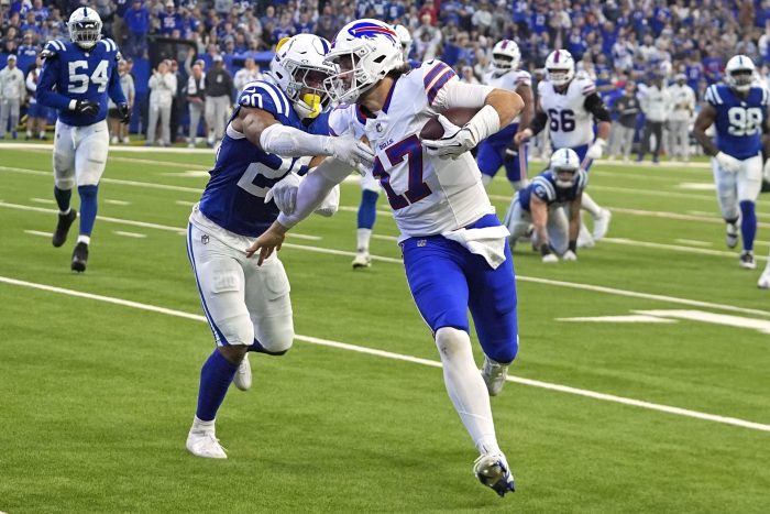 Allen’s interception on the Bills’ ensuing series set up the field goal that gave Indy a 13-10 lead, but Allen quickly regained control with his 13-yard TD run. Tyler Bass made field goals for Buffalo at the end of the first half and early in the fourth quarter, and Cook sealed the win with a 2-yard TD run early in the fourth.