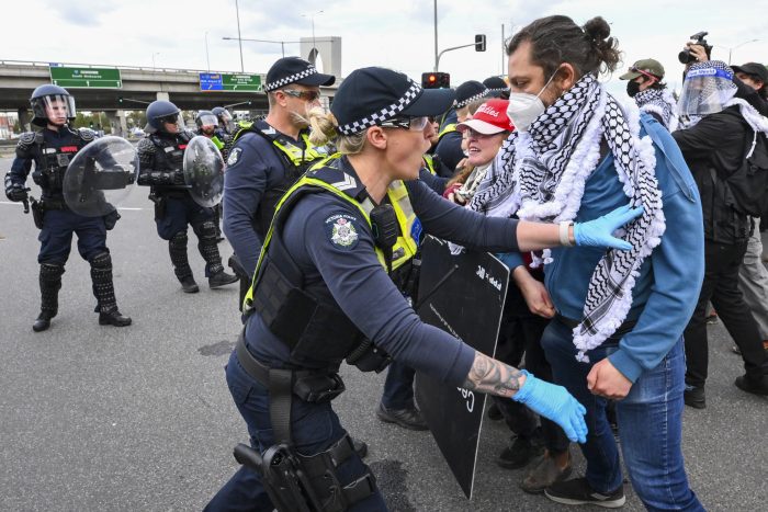 “Victoria Police is appalled at the behavior of some of the protesters,” the statement said, referring to the Victoria state force.