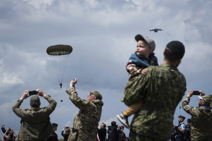 In Sannerville, Normandy, spectators turned their eyes skyward as some 400 paratroopers from Britain, Belgium, the United States and Canada participated in a multinational parachute drop.