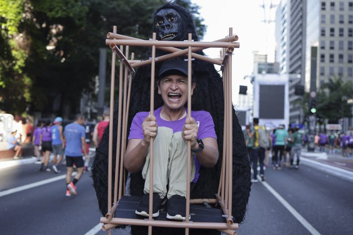 A person in a gorilla costume pushed a woman down Sao Silvestre road in São Paulo during a race. Members of the Zapatista National Liberation Army (EZLN) attended an event marking the 31st anniversary of the Zapatista uprising, in San Cristobal de las Casas, Mexico. People part of a migrant caravan made their way through Tapachula, Mexico. People rang in the new year in style on the beach in Rio de Janeiro.