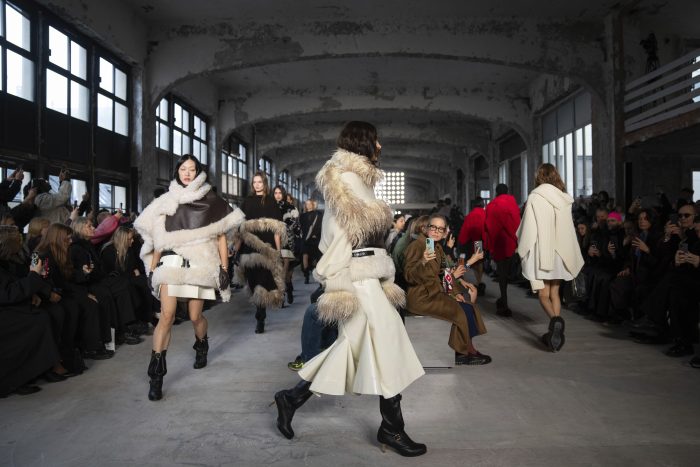 This season, Abe softened the brand’s signature deconstruction with an almost liquid elegance. Gone were the heavy-duty mashups of past seasons, replaced with sleek, elongated silhouettes that whispered rather than shouted. The designer took cues from her menswear collection, borrowing fur elements but reimagining them with a lighter touch — fur trims on jackets and tops, plush bags, even a fur T-shirt dress with a woven graphic that delivered effortless drama.