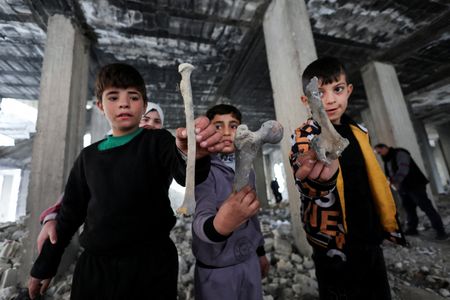 DAMASCUS (Reuters) -A hip bone in a blown-out building, part of a spine amid some debris, a few foot bones in a worn-out sock. The Tadamon district of Damascus is littered with bones, after what residents and rights groups described as years of killings there under the rule of Syria’s Bashar al-Assad.