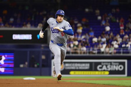 Ohtani smoked a double to lead off the game and then stole third for his 50th stolen base of the season, sliding under the tag from Marlins third baseman Connor Norby.