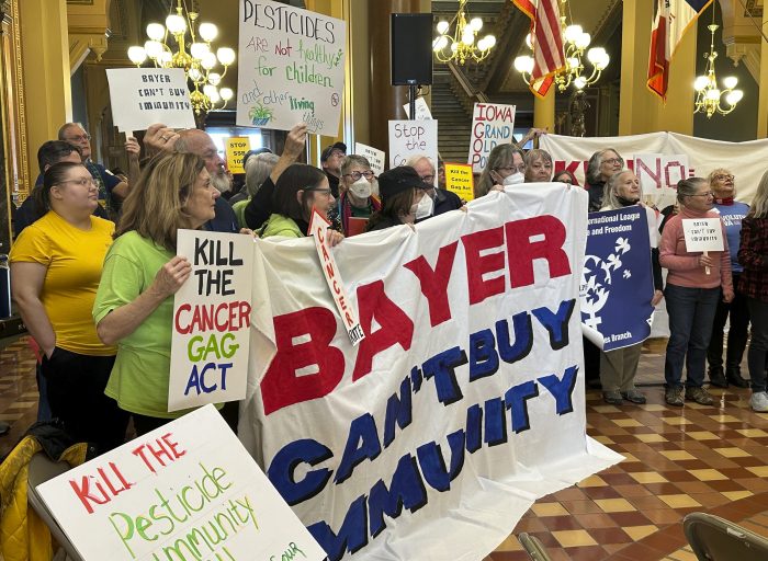 Opponents, including those who rallied Monday in Des Moines, say the bills would limit the rights of people to hold companies accountable if their products cause harm. Speakers took turns telling stories of family members throughout the state who have been diagnosed with cancers and shouted out to lawmakers that Iowa’s people are more important than corporate profits.