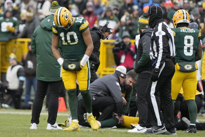 Love’s injury came early in the second quarter when he landed after flipping a pass to Josh Jacobs while facing heavy pressure. Earlier in the same series, Watson fell to the ground and clutched his right knee while running a pattern.