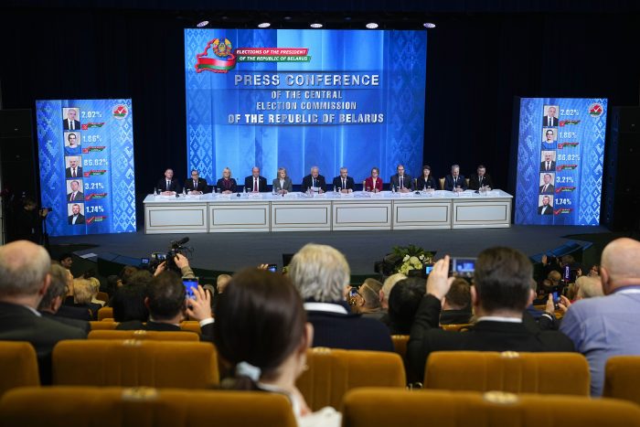 Belarus’ opposition activists and Western officials on Monday denounced an orchestrated election that extends the more than three-decade rule of authoritarian President Alexander Lukashenko. The country’s exiled opposition leader called the result “sheer nonsense.”