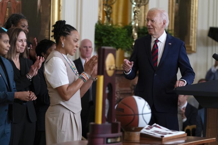 South Carolina went 38-0 on the way to its latest women’s title. It was head coach Dawn Staley’s third championship with the Gamecocks since 2017. Biden cheered South Carolina for ushering in an era of surging interest in women’s sports.