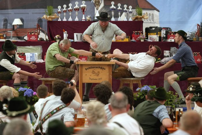 It’s thought that finger wrestling, popular in Germany’s Alpine region and neighboring Austria, originated as a way to settle disputes. The earliest depictions of the sport go back to the 19th century. Participants on Sunday wore the traditional Bavarian dress known as tracht.