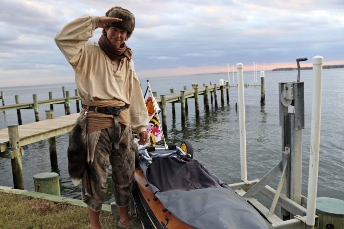 Clad in a rabbit-fur hat and clothes he made himself to resemble a pirate, he generally paddles between six and 10 hours a day in his 1982 decked vessel, its shell hollowed to stow supplies. Many nights, he sleeps in a tent by the water. However, he often gets invitations from readers of his blog to stay in their homes.
