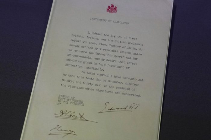 The letter writers range from paupers to princes. In an 1851 petition, an unemployed 71-year-old weaver named Daniel Rush begs authorities not to separate him and his wife by sending them to workhouses. It’s displayed alongside the Instrument of Abdication through which King Edward VIII gave up the throne in 1936 so that he could marry “the woman I love,” twice-divorced American Wallis Simpson.