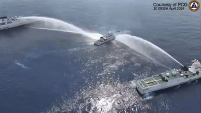 A Chinese coast guard ship used a water cannon against the fisheries vessel, the BRP Bankaw, and two other Chinese coast guard ships hit the Philippine coast guard ship, the BRP Bagacay, simultaneously from both sides, damaging part of its deck railing and a canopy, Tarriela added.