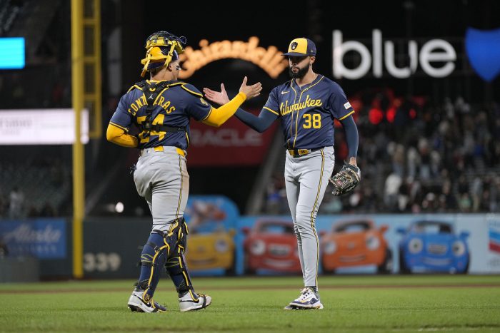 DL Hall, Trevor Megill and Devin Williams combined to shut out the Giants over the final 3 2/3 innings. Williams earned his 10th save, striking out Tyler Fitzgerald with the tying run on second to end the game.