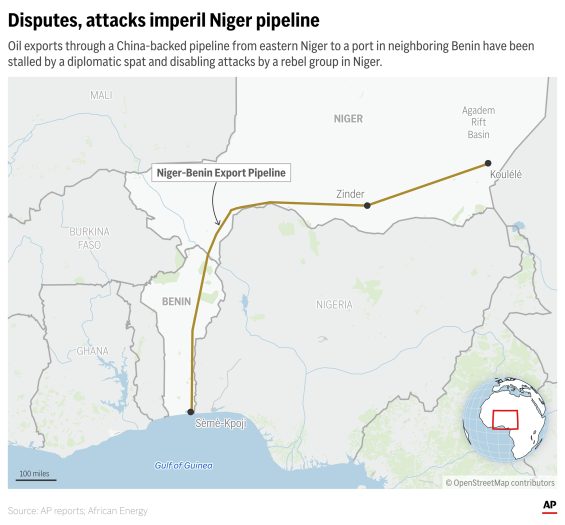 ABUJA, Nigeria (AP) — A China-backed pipeline that would make Niger an oil-exporting country is being threatened by an internal security crisis and a diplomatic dispute with neighoring Benin, both as a result of last year’s coup that toppled the West African nation’s democratic government.
