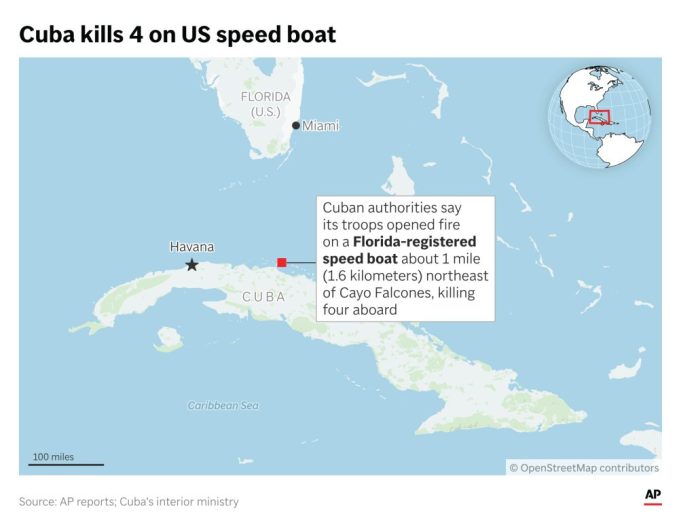 The announcement came hours after Cuba said its soldiers killed four people and wounded six others aboard a Florida-registered speed boat that had entered Cuban waters and opened fire on the soldiers first, injuring one Cuban officer.