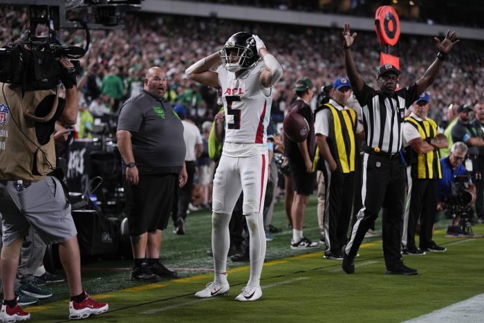 Falcons wide receiver Drake London was penalized after catching a touchdown pass in the final minute of Atlanta’s 22-21 victory in Philadelphia on Monday night for pretending to shoot in the air, a violation of a longstanding NFL rule that prohibits violent gestures. London immediately apologized on the sideline, according to Falcons coach Raheem Morris, […]