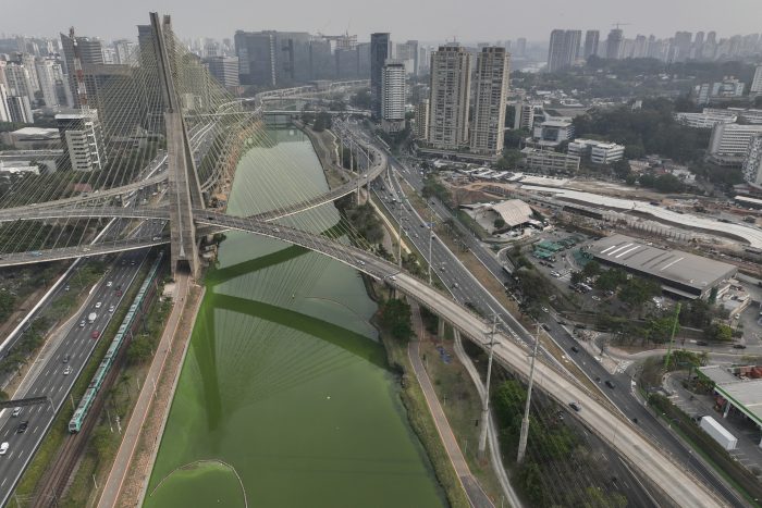 The state’s environmental authority attributes the Pinheiros River’s new green hue to an algae bloom, the result of severe drought that has significantly lowered water levels. The phenomenon was visible starting Monday and continued Tuesday. Those same days, the city suffered smoke-filled air, which the agency attributed to a hot, dry mass complicating the dispersal of pollutants originating in forested areas with ongoing wildfires.