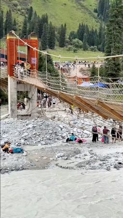 Videos circulating on social media, verified by Reuters, show a low-hanging suspension bridge tilted to one side with handrails made from cables dangling between the walkway and the ground below. Part of the bridge hangs over a river.