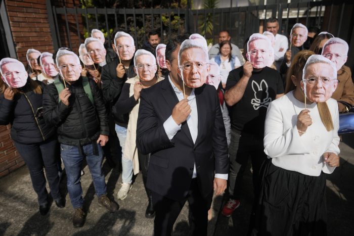 Dozens of supporters gathered outside the courthouse Monday, waving Colombian flags and carrying masks depicting the former president’s face.