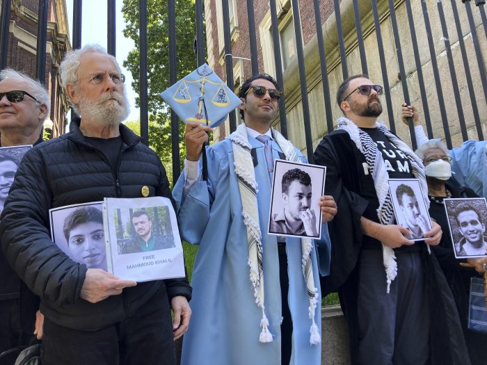 Draped in a keffiyeh, Mahdawi, 34, paused to listen to the swell of cheers from his fellow graduates. Then he joined a vigil just outside Columbia’s gates, raising a photograph of his classmate Mahmoud Khalil, who remains in federal custody.