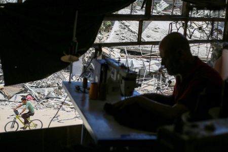 KHAN YOUNIS, Gaza Strip (Reuters) – In an upstairs room behind the shattered walls of a Gaza building, sewing machines whir as men work at crowded tables – a Palestinian businessman’s effort to aid the enclave’s economy after nine months of Israeli bombardment.