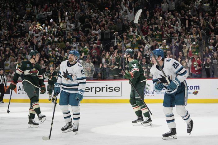 In the highest scoring game of the night, Eriksson Ek had a career-high four goals in his return from a lower-body injury in the Wild’s 8-7 overtime victory over the Sharks. San Jose was led by Celebrini, a rookie star who finished with three goals and two assists.