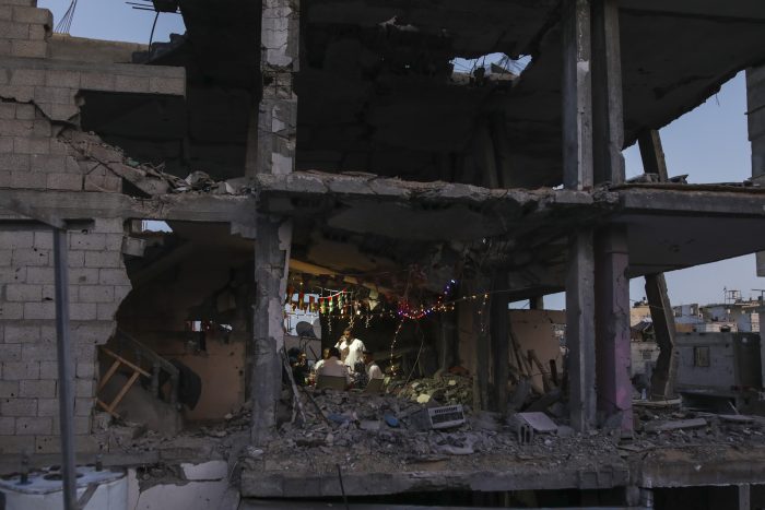 In Gaza’s southern city of Rafah, AP video showed a long table set for the breaking of the day’s Ramadan fast, snaking through the ruins and lit by strings of lights as the sky darkened.