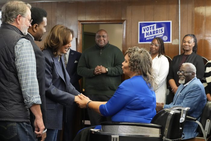 After attending church in Detroit, Harris greeted customers and picked up lunch at Kuzzo’s Chicken and Waffles, where she had collard greens at the Detroit restaurant owned by former Detroit Lions player Ron Bartell, a Detroit native. Later, Harris stopped by Elam Barber Shop, a Black-owned business in Pontiac, where she took part in a moderated conversation with local leaders and Black men.