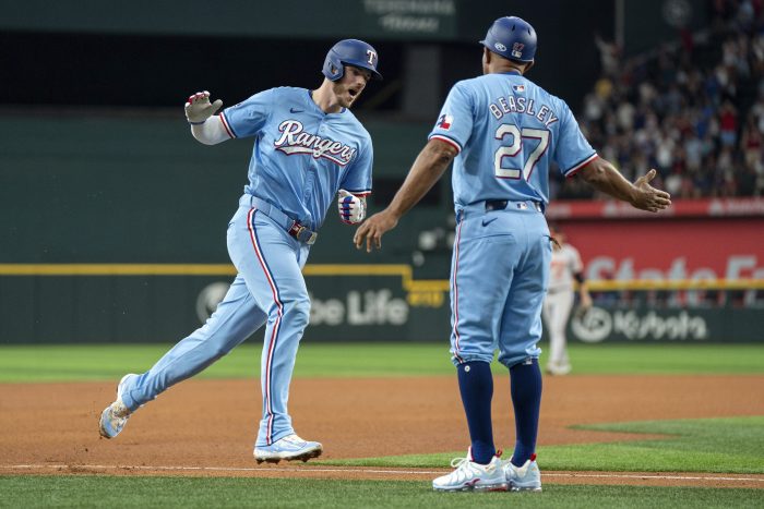 Kremer (4-6) allowed three runs on five hits and three walks with two strikeouts in 5 1/3 innings. It was the right-hander’s first appearance against the Rangers since giving up six runs in 1 2/3 innings in his postseason debut last October in the Rangers’ ALDS-clinching 7-1 victory at home.