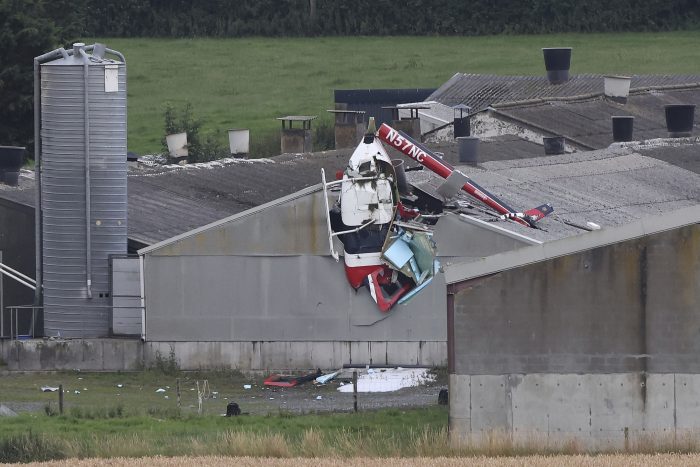 2 men are killed when their helicopter crashes into a hog house in central Ireland