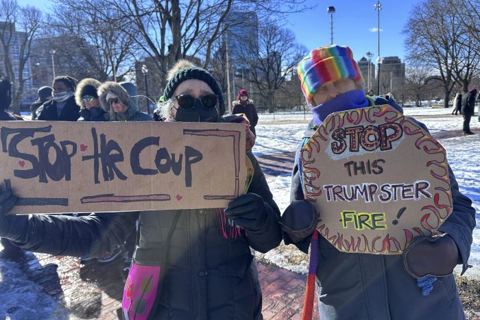 BOSTON (AP) — Chanting “Stop the coup” and carrying signs including “I Love Democracy” and “Resist,” hundreds of people rallied Friday in Boston against the policies of President Donald Trump and his billionaire adviser Elon Musk. The peaceful rally in freezing conditions was supported by 100 civil rights, environmental and progressive groups from Massachusetts. Speaker […]