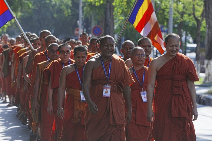 They marched from the country’s main religious school near the Royal Palace in the capital, Phnom Penh, to a nearby temple, where they were joined by nuns and laymen and women.