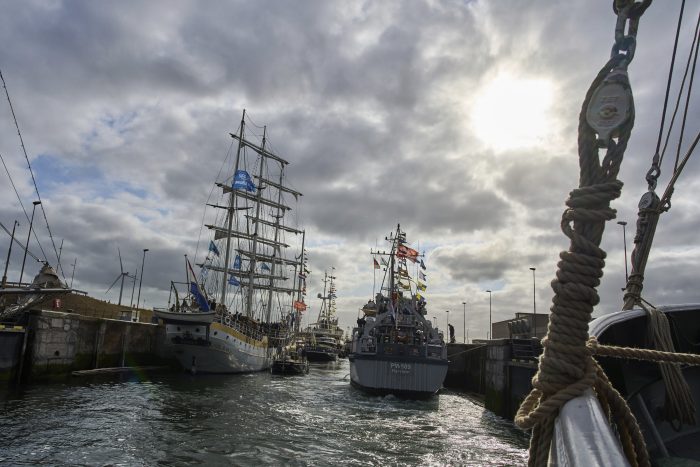 A puff of orange smoke erupted into the sky and ships’ horns sounded as the replica three-masted clipper Stad Amsterdam passed through a lock to mark the official start of the event. Each ship is greeted with two cannon shots and its country’s national anthem as it enters the harbor.