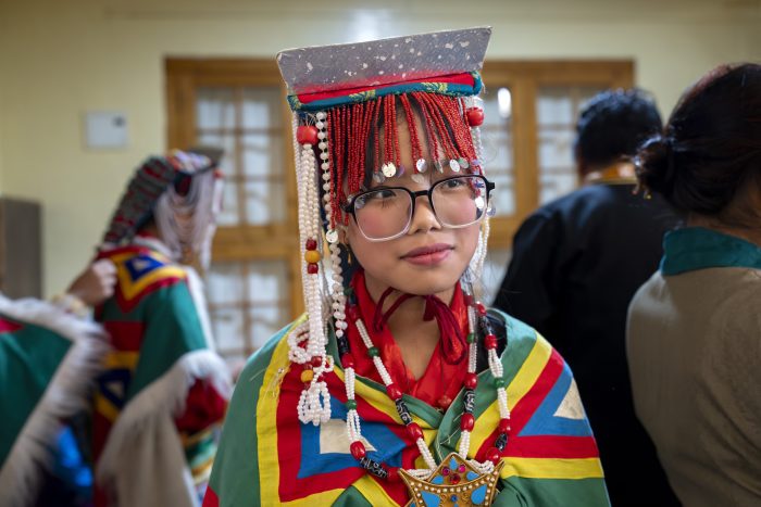 A volunteer distributed Indian sweets to exiled Tibetan Buddhist nuns as teachers helped children with their make-up as they prepared to perform traditional dances.