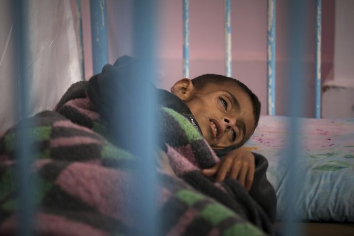 Osama al-Raqab’s cystic fibrosis has worsened since the start of the war. Lack of meat, fish and enzyme tablets to help him digest food meant repeated hospital visits and long bouts of chest infections and acute diarrhea, says his mother, Mona. His bones poke through his skin. Osama, 5, weighs 20 pounds (9 kilos) and can hardly move or speak. Canned food offers him no nutrition.